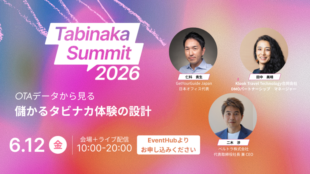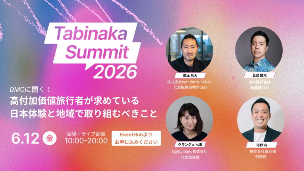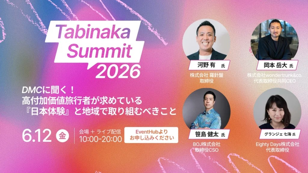 訪日外国人観光客の急増とともに、旅行者が求める価値は「モノ」から「コト」、そして「リアルな体験」へと進化しています。そんな中、観光業界の最前線で活躍するツアーオペレーター、体験事業者、行政、OTA、DMOなどが一堂に会し、「旅の最中に生まれる体験価値」をテーマに議論・学び・つながるのがこのタビナカサミットです。
